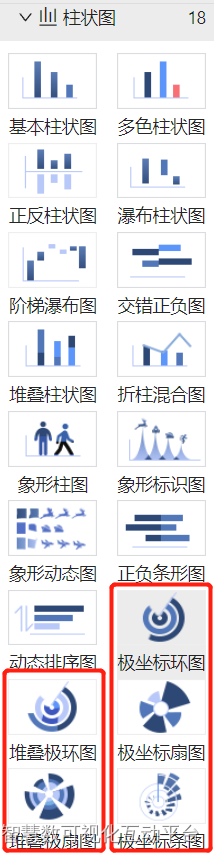 接下里就以极坐标环图、堆叠极环图、极坐标扇图、堆叠极扇图为例讲解一下