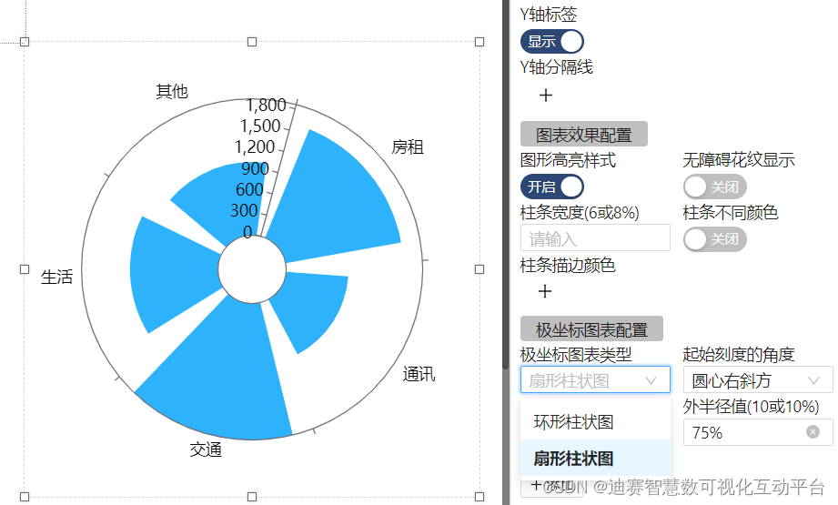 点击选择扇形柱状图,则会对应的转换极坐标扇图