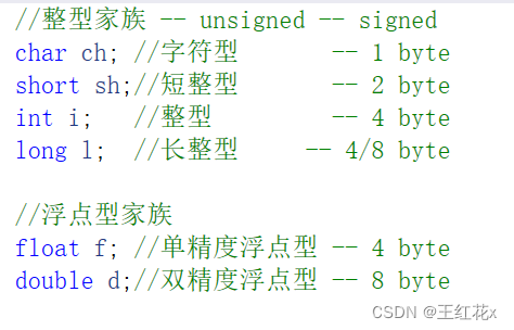 内置类型是C语言本身就有的类型。根据数据在内存中存储的方式,我们可以将类型分为2类,一类是整型,另一类是浮点型,因为char类型在内存中存储的是其ASCII码值,所以也可以将其划分到整型家族。