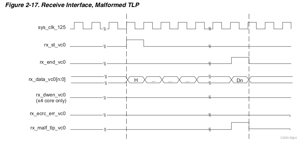 当一个TLP数据包发送过来时,rx_st_vc0会被拉高,此时第一个数据会出现在数据线上,每一个时钟一个数据,当rx_end_vc0为高时,表示此时数据线上是最后一个数据。如果出现ECRC错误,则在最后一个数据时刻rx_ecrc_err_vc0会被拉高;如果TLP的长度有问题,则rx_malf_tlp_vc0会被拉高