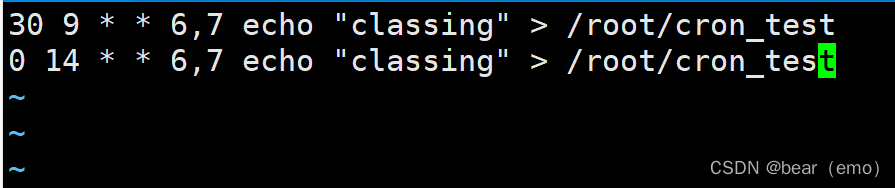 2.crontab配置,每周六,周日 9点半,14点 提醒我上RHCE课 写入root家目录中的cron_test文件中