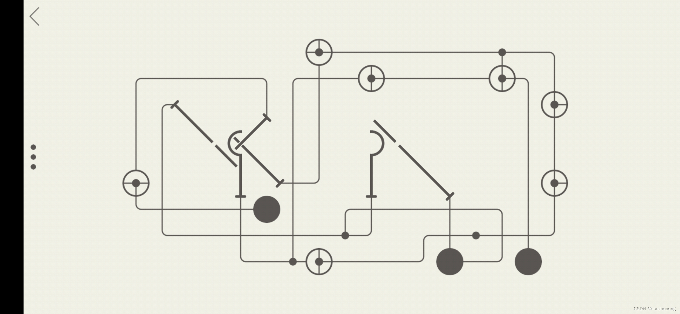 圆圈里面的机关可以调控开关和线条的对应关系,一个开关可能可以控制多个线条,机关可以调控开关不同的时候控制不同的线条。