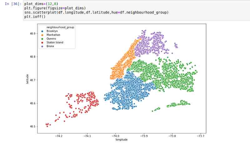 既然我们有经度和经度以及邻里数据,让我们创建一个散点图: