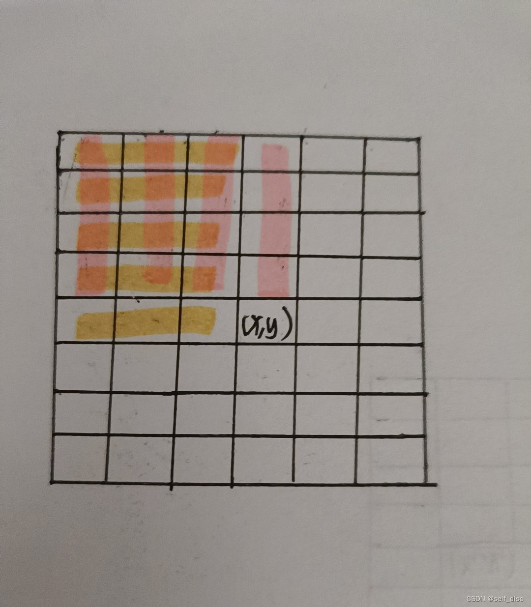 f(x,y)可以有图中红色区域和黄色区域转移而来,故而可得到转移方程