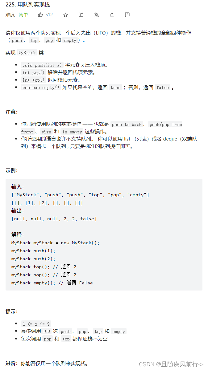 3.出栈,将非空队列出队到另一个队列,直到剩一个元素。这个元素就是栈顶元素,然后出队列。