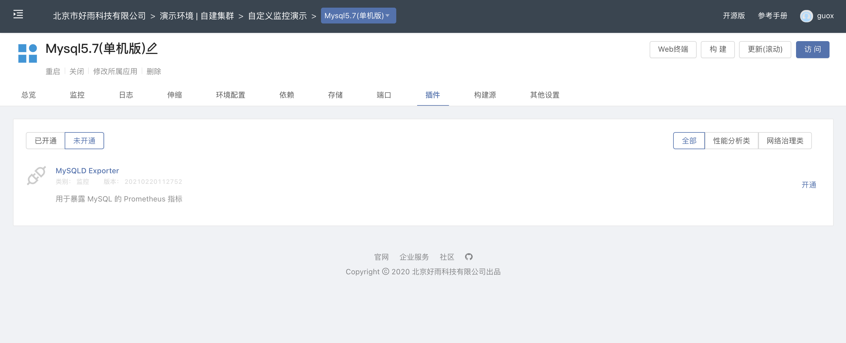 在已有的 Mysql 服务组件的插件页面可以 开通 MySQLD Exporter 插件。