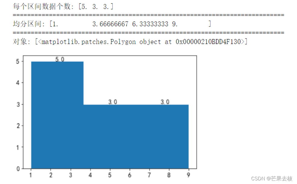 # n:数组。每个区间内值出现的个数,如果density=True,那么这个将返回的是频率/组距。