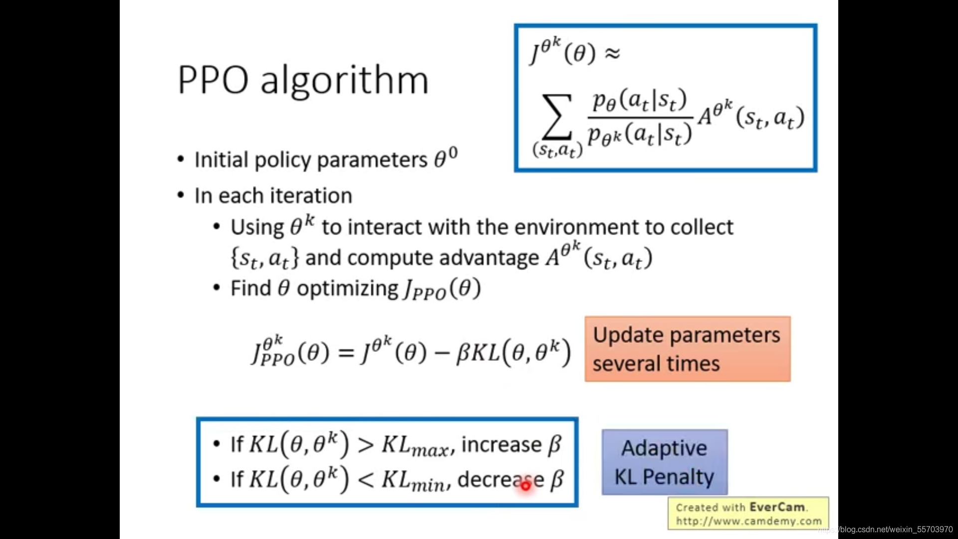Let's talk about it PPO And its predecessor TRPO, The specific method is to add a similar regularation(ML Of ) The item \beta KL(\theta,\theta').TRPO It is changed into a constraint, The results are similar, but practical application TRPO It's much more difficult .