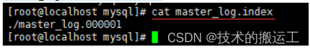master_log.000001 文件我们无法查看,但我们可以使用 cat 命令查看 master_log.index,其实 master_log.index 的内容表示的是 master_log.000001 所在的位置
