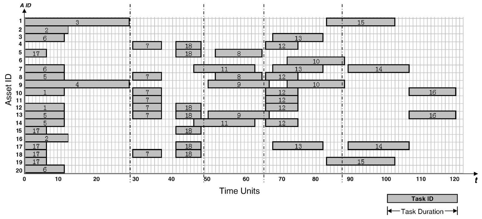 图9展示了最优调度,每个资产都在特定的时间段被分配给一个或者多个任务。调度可以分为五个阶段:0–29、30–49、50–66、67–88,以及89–122。在两个连续的时间阶段之间,没有或很少有交错任务,因此可以识别边界。