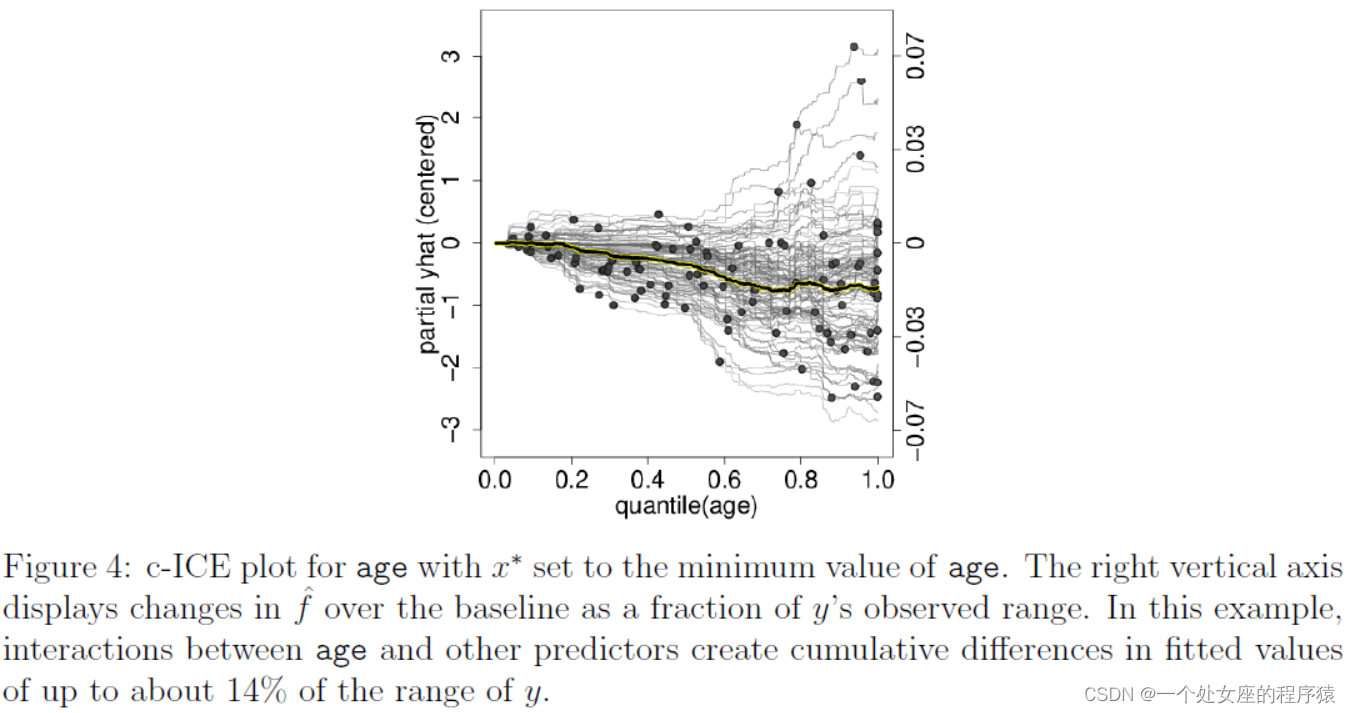 where the unadorned fˆ denotes the fitted model and 1 is a vector of 1’s of the appropriate dimension. Hence the point (x∗, fˆ(x∗, xCi)) acts as a “base case” for each curve. If x∗ is the minimum value of xS , for example, this ensures that all curves originate at 0, thus removing the differences in level due to the different xCi’s. At the maximum xS value, each centered curve’s level reflects the cumulative effect of xS on fˆ relative to the base case. The result is a plot that better isolates the combined effect of xS on fˆ, holding xC fixed. Figure 4 shows a c-ICE plot for the predictor age of the BHD for the same RF model as examined previously. From the c-ICE plot we can now see clearly that the cumulative effect of age on predicted median value increases for some cases, and decreases for others. Such divergences of the centered curves suggest the existence of interactions between xS and xC in the model. Also, the magnitude of the effect, as a fraction of the range of y, can be seen in the vertical axis displayed on the right of the graph. | Among them, undecorated f^ Represents the fitting model ,1 Is the appropriate dimension 1 Vector . therefore , spot (x∗, f^(x∗, xCi)) Act as “ Basic information ”. for example , If x∗ yes xS The minimum value of , This ensures that all curves originate from 0, Thus eliminating differences xCi Resulting in level differences . At the biggest xS Value place , The level of each center curve reflects xS Yes f^ Cumulative impact relative to the basic situation . The result is that a graph can be better separated xS Yes f^ The combination of , keep xC Fix . chart 4 It shows the same as the previous check RF Model BHD Predictor age c-ICE chart . from c-ICE Figure we can see clearly now , The cumulative effect of age on the median prediction will increase in some cases , In other cases, it will decrease . This difference in the center curve indicates that xS and xC There is an interaction between . Besides , You can see the size of the effect in the vertical axis displayed on the right side of the chart , As y Part of the scope . |