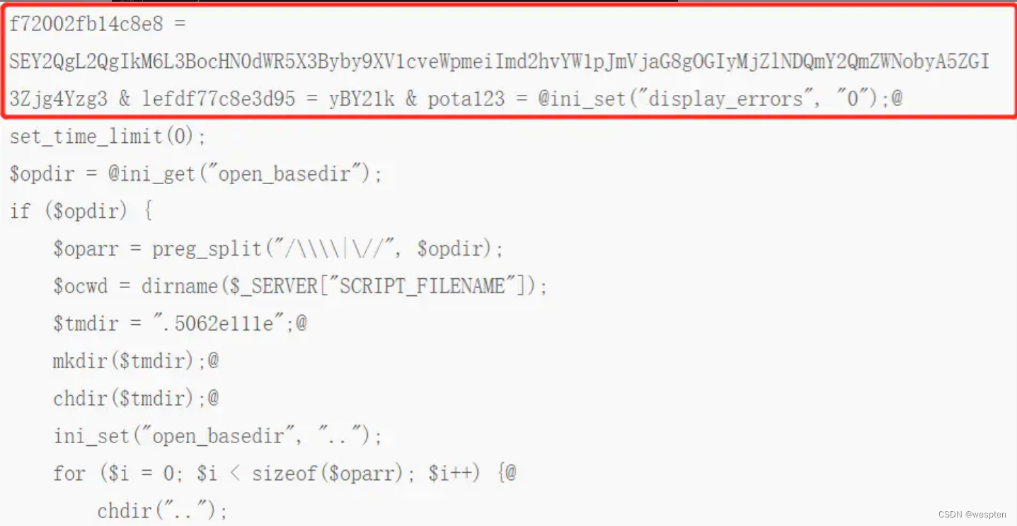 我们解密后得知变量的内容为到这里,我们已经获取了执行命令的唯一特征。(PS:这里我们可以直接通过对base64编码的方式来确定命令内容,具体细节就不多说了懂的都懂。)