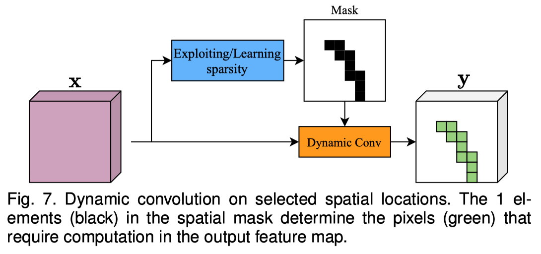 1) Dynamic sparse convolution . In order to reduce unnecessary calculation at places with small amount of information , Convolution can only be performed on pixels sampled by the policy . Existing sampling strategies include 1) Use the inherent sparsity of input ;2) Predict the position of zero element on the output ; and 3) Estimate the significance of pixels . A typical method is to use additional branches to generate a spatial mask , Determine the execution of convolution on each pixel ( As shown in the figure above ).