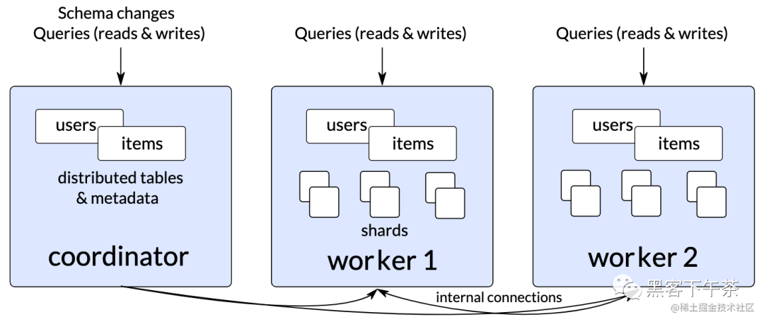chart 2:Citus 11.0 beta colony , among users and items It's a distributed table , And use the new automatic metadata synchronization function , Their metadata will be synchronized to all nodes .