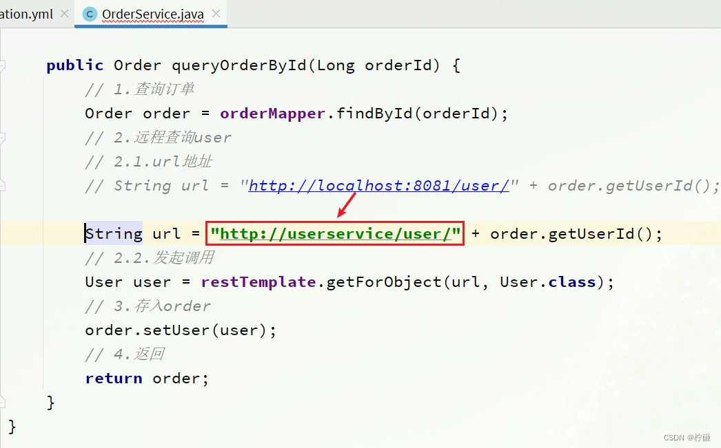 modify order-service In service cn.itcast.order.service Under bag OrderService Class queryOrderById Method . Modify access url route , Use the service name instead of ip、 port :