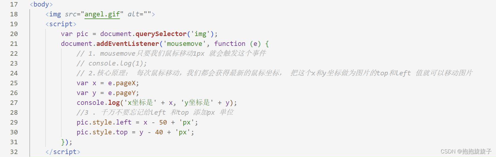 3.核心原理:每次鼠標移動,我們都會獲得最新的鼠標坐標,把這個x和y坐標做為圖片的top和left值就可以移動圖片