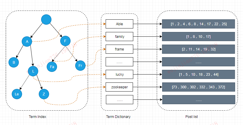 But if term Too much ,term dictionary It's going to be big , It's not realistic to put memory , Hence the Term Index , It's like an index page in a dictionary ,A What's at the beginning term, Which page are they on , You can understand term index It's a tree . This tree will not contain all term, It contains term Some prefixes of . adopt term index Can quickly locate term dictionary One of the offset, And then look it up from this position in reverse order .