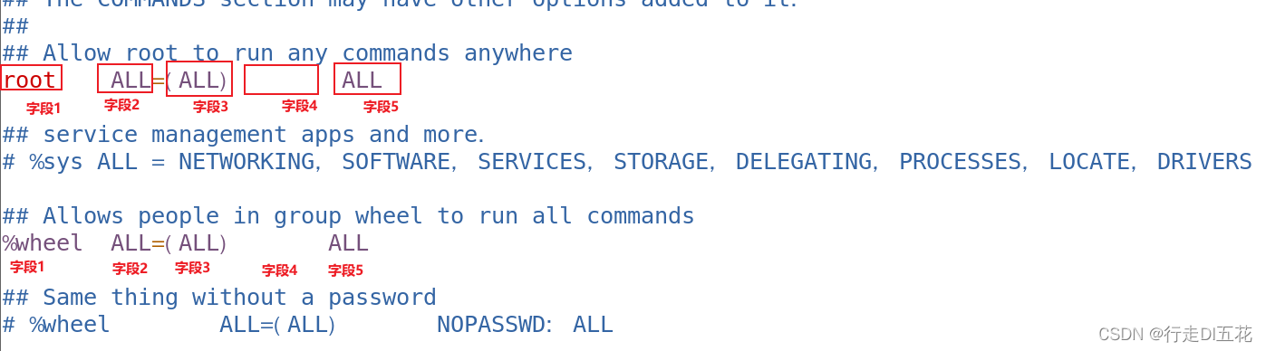 Field 3: If omitted , amount to (root:root), Means that it can be passed sudo It's up to root; If (ALL) perhaps (ALL:ALL), Means to be able to raise the right to ( Any user : Any user group )