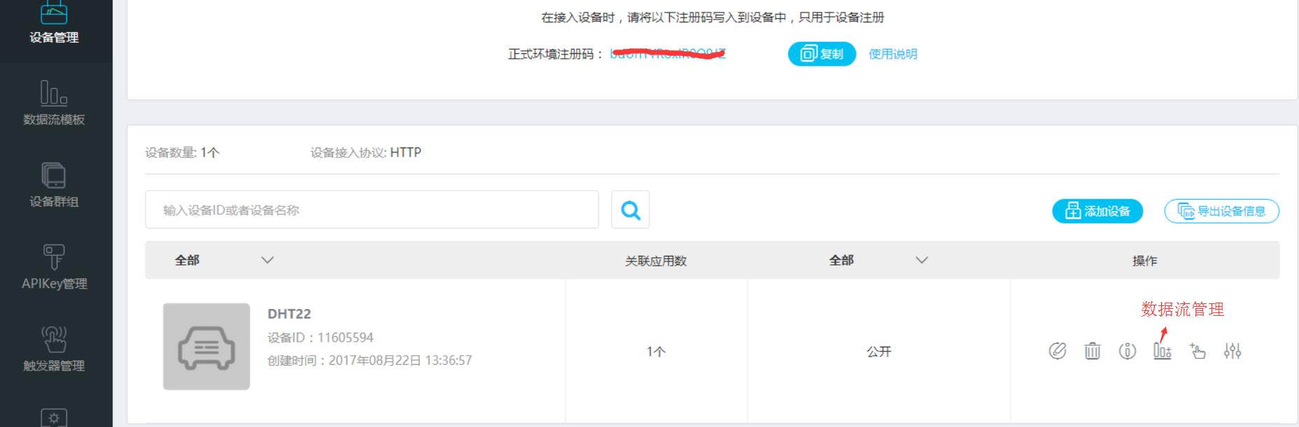 此时我们可以登录自己的账号打开设备管理,然后点击设备下的数据流管理通过查看设备下的数据流来确认数据是否上传。