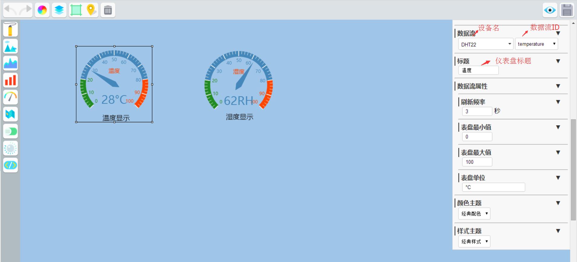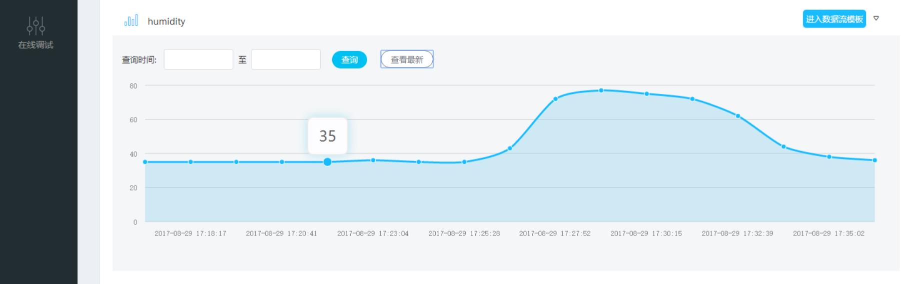 创建好后点击保存预览就可以实时显示自己上传的温湿度数据。