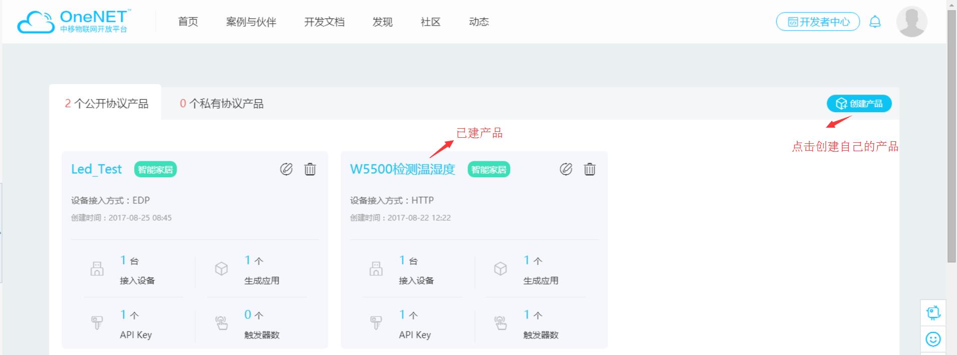 登录以后点击右上角开发者中心并进入相应的产品列表界面;
