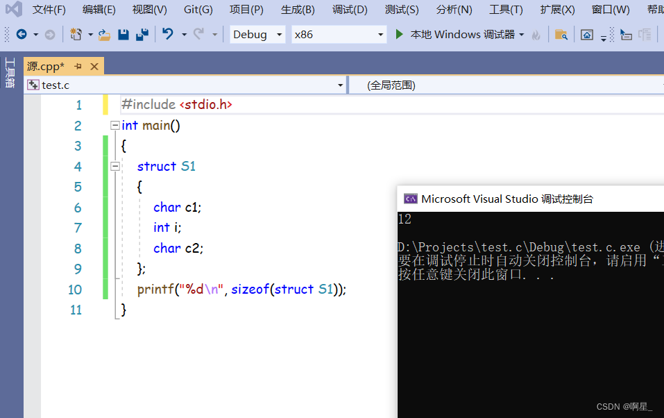 printf("%d\n", sizeof(struct S1));大小不是1+4+1=6个字节哦。我们先看结果: