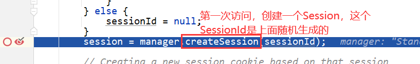 一直跟进request.getSession()方法,发现修改Cookie中JSESSIONID之前和之后都是在这个地方返回的session对象,证明在getSession()之前,session一定被初始化了,修改Cookie不影响直接获取session
