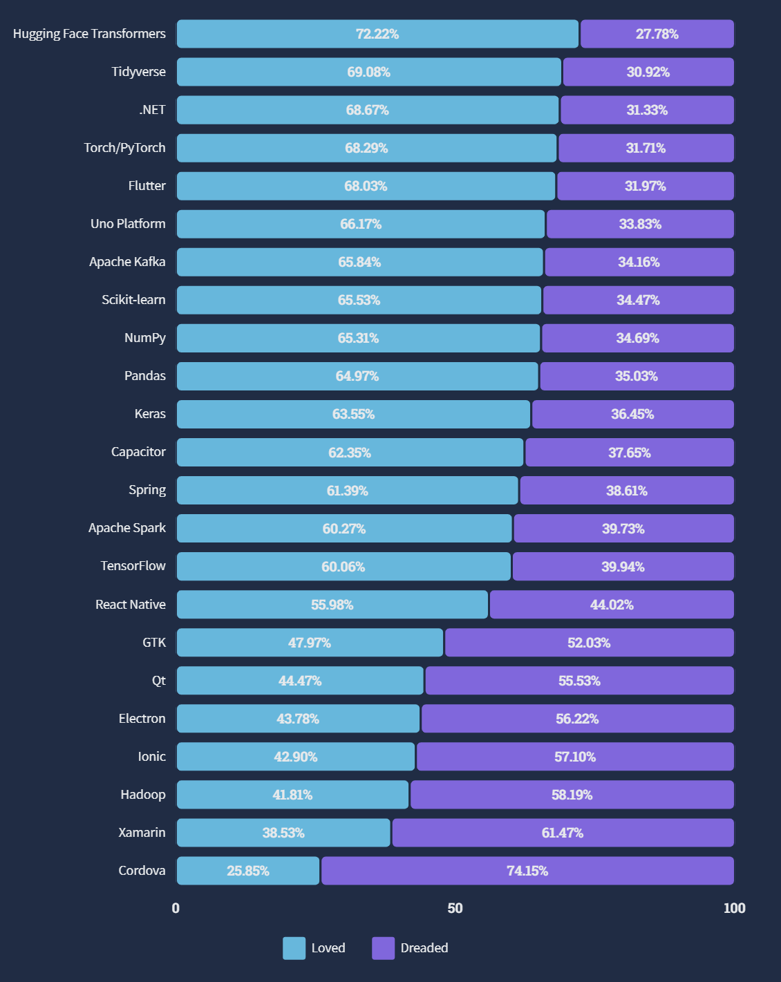 Hugging Face Transformers 是最受喜爱的库,Tensorflow 最想被学习的。