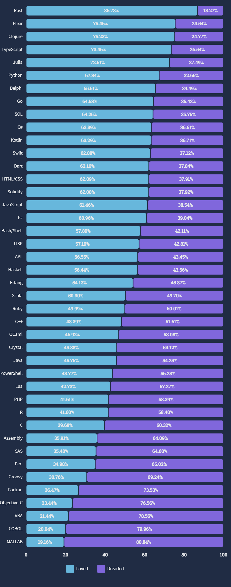 - Rust 已连续第七年成为最受喜爱的语言,87% 的开发人员表示他们希望继续使用它。