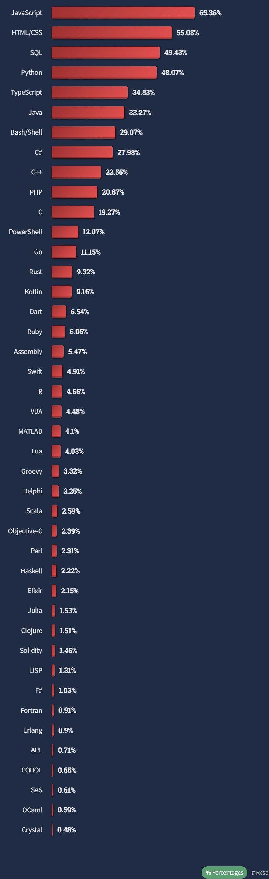 专业开发人员最常用的前五名语言没有变化;JavaScript 连续第十年成为最流行的编程语言。但报告指出,对于那些正在学习编程的人来说,HTML/CSS、Javascript 和 Python 几乎并列成为最常用的语言。还在学习阶段的人比专业开发者更有可能使用 Python(58% 对 44%)、C++(35% 对 20%)和 C(32% 对 17%)。与专业开发人员相比,尚在学习编程的人则更少使用 SQL(38% 对 53%)、TypeScript(15% 对 40%)和 Bash/Shell(19% 对 29%)。