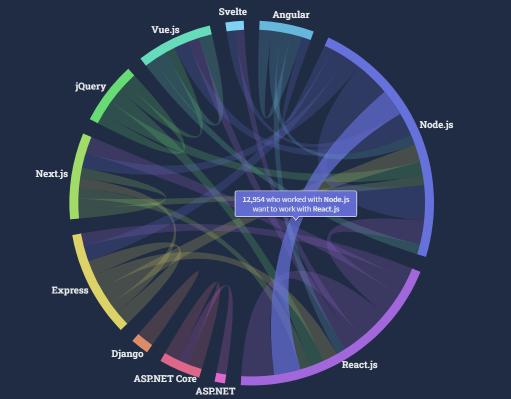 Node.js 和 React.js 是最常用的两种 Web 技术。使用 Angular 的专业开发人员比初学者要多(23% 对 10%),ASP.NET(16% 对 10%)和 ASP.NET Core(21% 对 10%)也是。