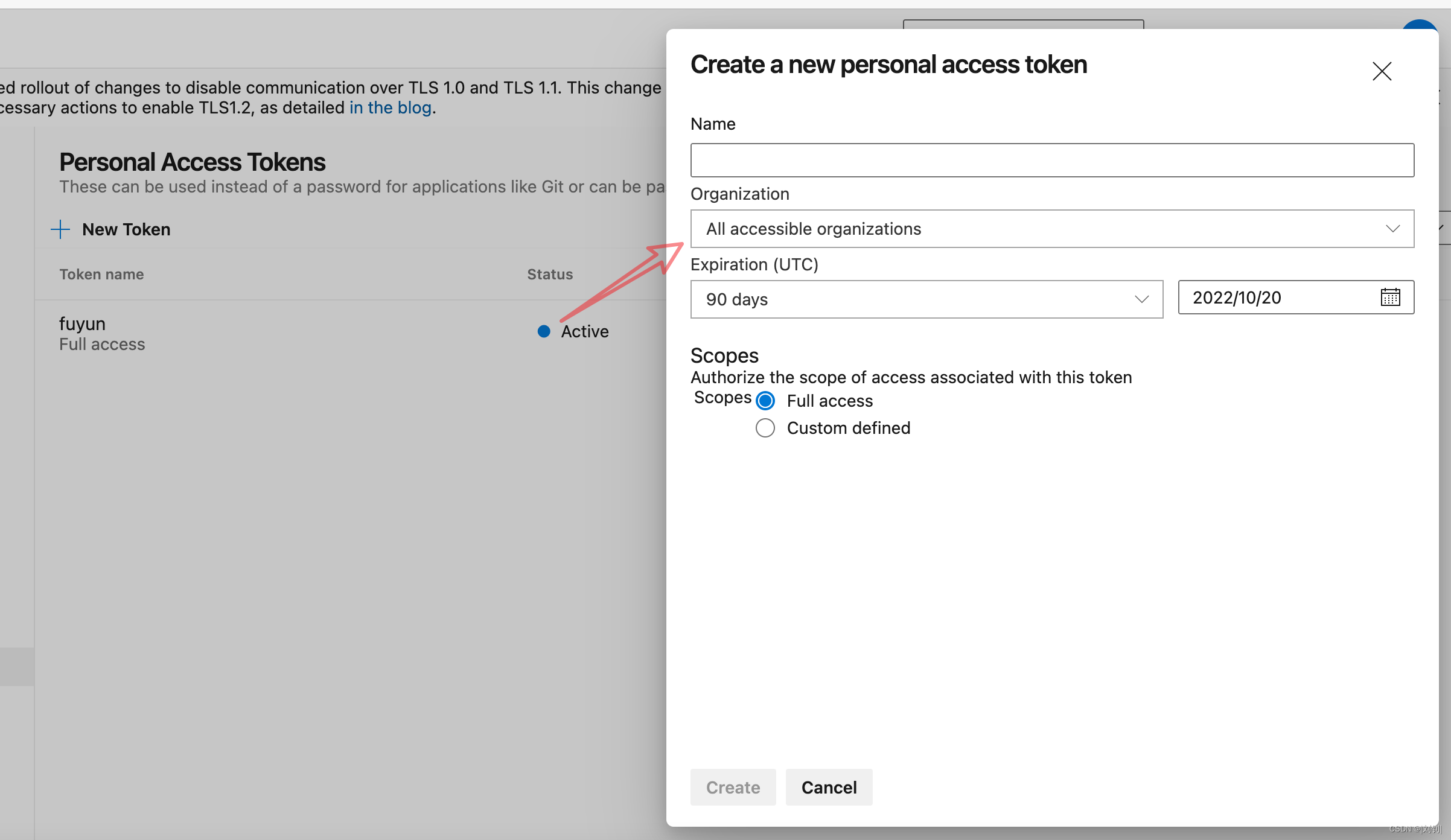 进入组织的主页后,点击右上角的Security,点击创建新的个人访问令牌,这里特别要注意Organization要选择all accessible organizations,Scopes要选择Full access,否则后面发布会失败。