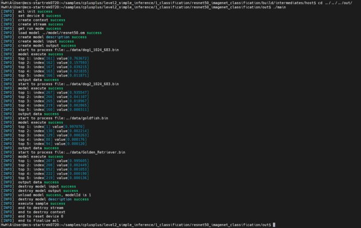 可以在样例目录(cplusplus/level2_simple_inference/1_classification/resnet50_imagenet_classification)下的out文件夹中找到编译好的可执行main文件,接下来我们直接运行main文件
