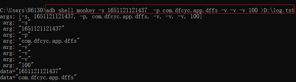 adb shell monkey -p < Package name > -v -v -v 100 >D:\log.txt: Specify to apply random operations 100 And print the log to the specified path / file