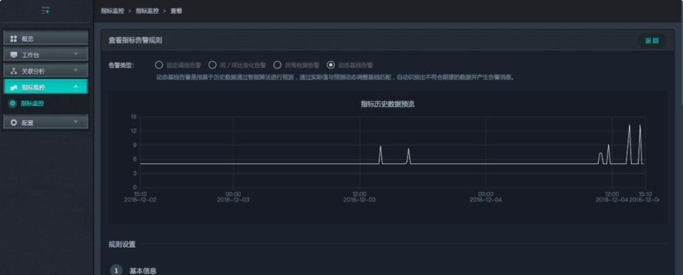 基于历史数据,利用智能算法进行深度学习后,对未来一段时间内的每个时间点的数值进行精准预测,以预测值作为基线,并通过比较实际值与基线的偏离度(百分比差异)来监控和告警。