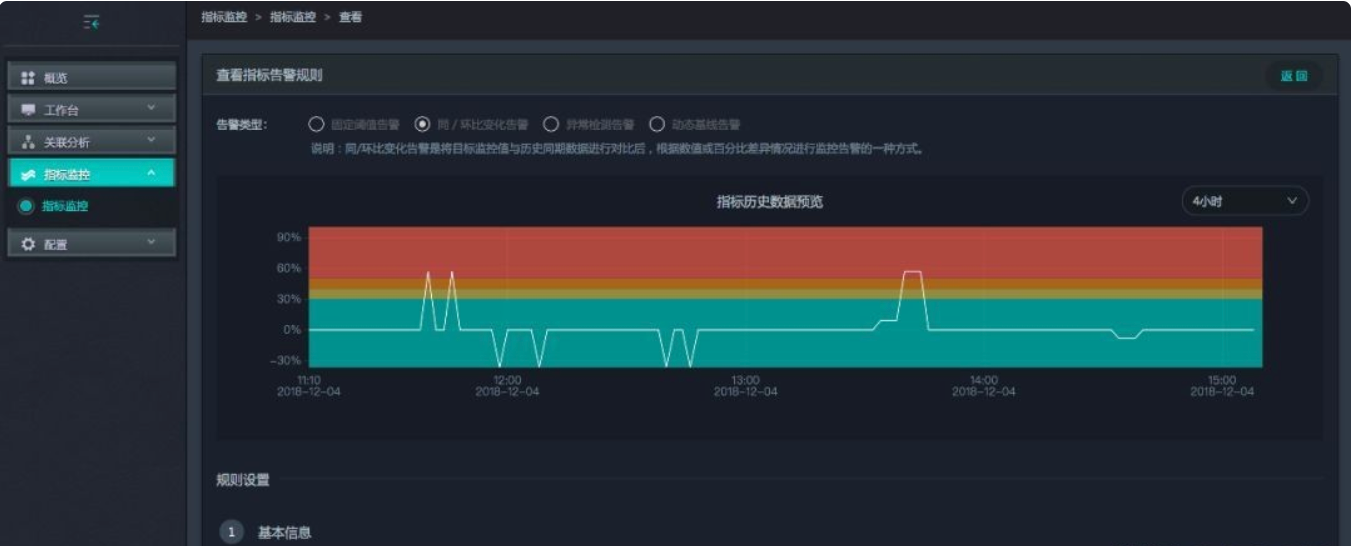 用于发现某个待监测指标的变化趋势是持续变好还是持续变坏。将目标监控值与历史同期数据的分布和同环比的变化情况进行对比,根据数值或百分比差异情况判断新进数据是否异常,并作出判断是否进行告警。