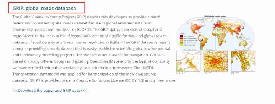 GRIP The dataset is Dutch GLOBIO Global road integration data produced by the team based on many different road data , It aims to provide road data sets for global environmental and biodiversity research projects , The data set consists of global vector road data set and 8km The resolution road density raster dataset consists of two parts .