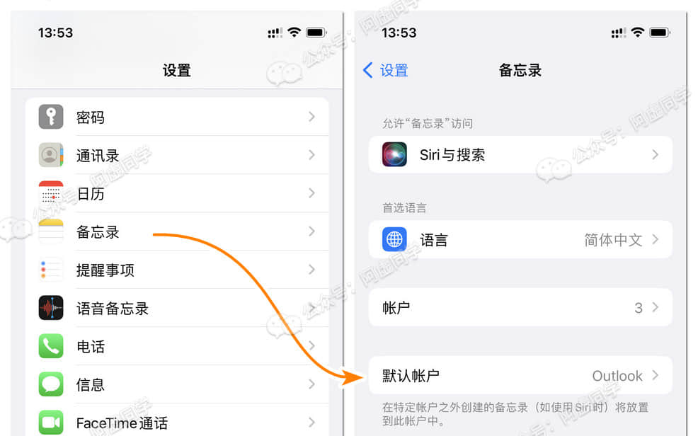 手机上则是打开 iPhone 的设置 » 备忘录 » 账户
