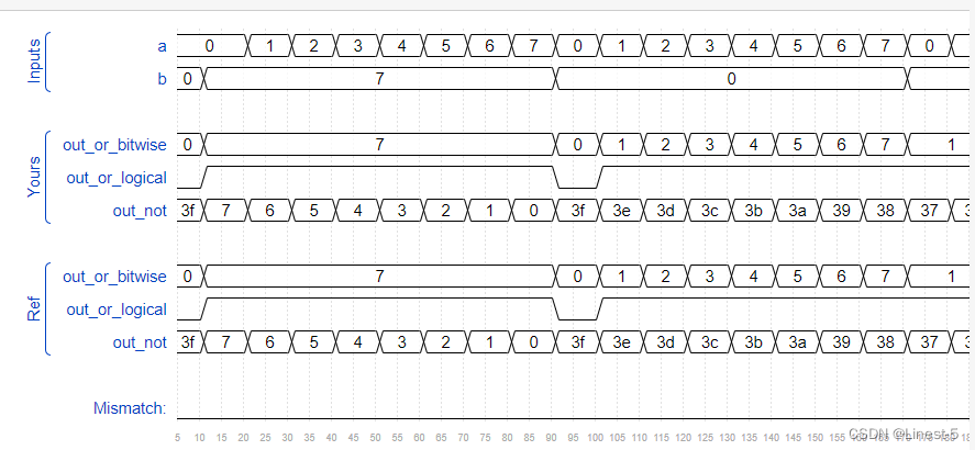 Build one with two 3 Bit input circuit , This input calculates the bitwise of two vectors OR、 The logic of two vectors OR And the inverse of two vectors (NOT). take The inverse function of is placed in The top half of ( Ascend the throne [5:3]), take The inverse function of is placed in the lower part .