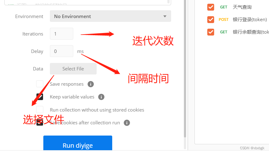 The left side is the batch running settings, such as the number of iterations, the interval between iterations, the selected file (Save the test data locally and run it at one timeThe data file value in the parameter is the same as the global variable, use{{}}, use the value of the data file in the assertion:data.Field name)