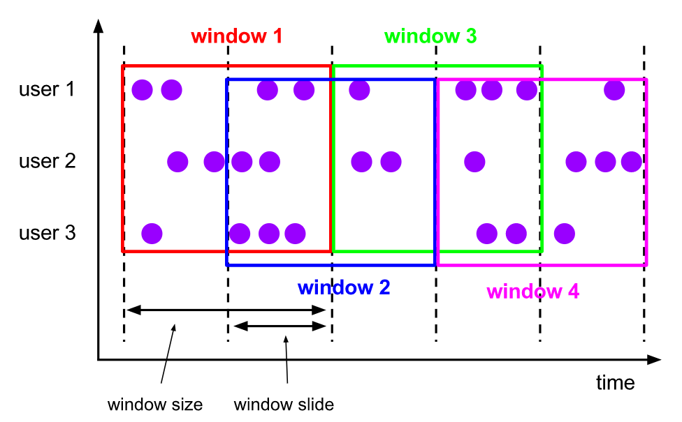 滑动窗口和滚动窗口的区别在于,多了一个滑动维度,也就是说窗口仍然是固定长度,但是窗口会以一个固定步长进行滑动。