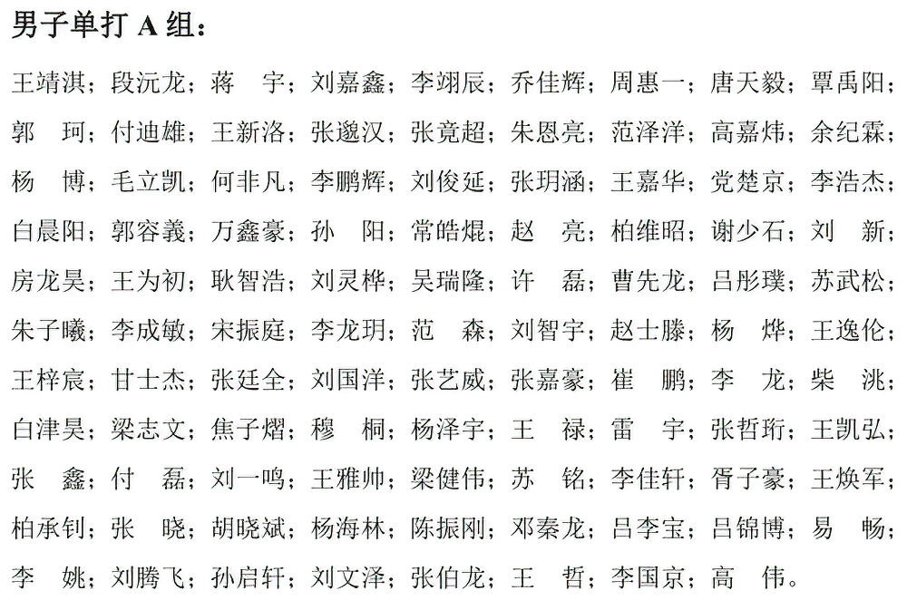 ' Sun Yang ', ' Chang Haokun ', ' Zhao Liang ', ' Baiweizhao ', ' Xie Shaoshi ', ' Liu Xin ', ' Fanglonghao ', ' Wang Weichu ', ' Gengzhihao ', ' Liulinghua ', ' Wuruilong ', ' Xu Lei ', ' Caoxianlong ', ' Lvtongpu ', ' Suwusong ',