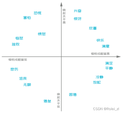 According to these two dimensions , We can find the position of some basic emotions in the following coordinate axes : Panic is shouting , Low pleasant mood ; Joy is shouting , High happy mood ; Grief is low arousal , Low pleasant mood ; Calm is low arousal , High happy mood