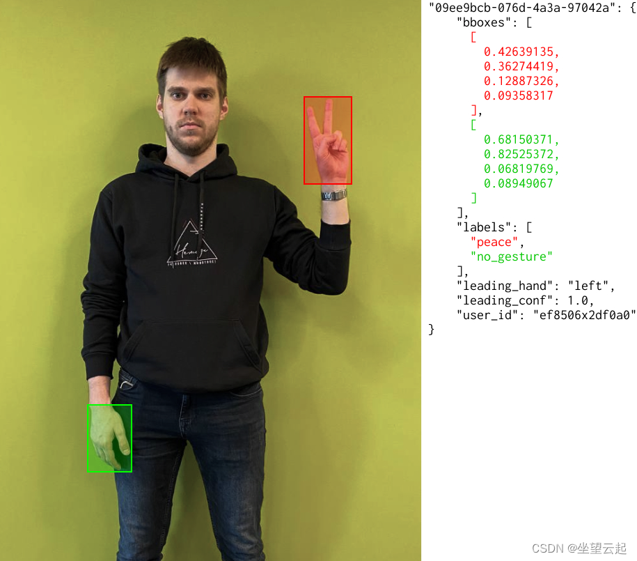 Except for gesture classification ,HaGRID It can also be used for hand detection problems ( Each image has one frame n One hand corresponds to n A bounding box ) And two binary classification problems :(1) gesture / Non gesture and (2) Right / left hand 7. chart 3 Provides an example of a tag for a sample in a dataset .