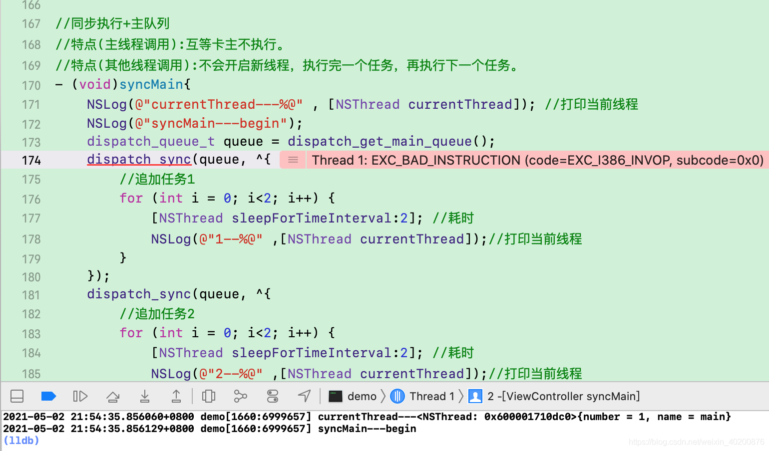 1 、 Invoking synchronous execution in main thread + Home line