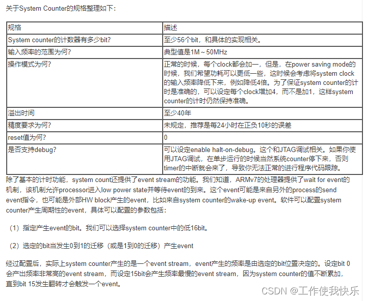 ARM generic timer The hardware block Mainly SOC Upper System counter( Multiple process share , Used to record the passage of time ) And attached to each processor Upper Timer( Used to trigger timer event) form , Other generic timer The hardware circuit of is mainly used for communication generic time event Of . For example, each processor Medium timer and system counter Peripherals interact , each processor Medium timer Information exchange .System counter Its function is very simple , It is to calculate how many input clocks have passed clock, The beginning was 0, every last clock,System counter Will add one .System counter Of counter value It needs to be distributed to all timer in , in other words , From each timer From the perspective of ,system counter value It should be consistent .Timer It's actually a timer , It can define a specified time , When it's time , will assert An external output signal ( It can be output to GIC, As a interrupt source).