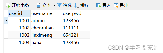 //组装插入SQL语句---id自增 只需要插入用户名和密码--插入新用户 第一个位置放用户名 第二个位置放密码 -- 传参