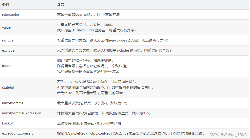 @Retryable Note the functions of each parameter as follows